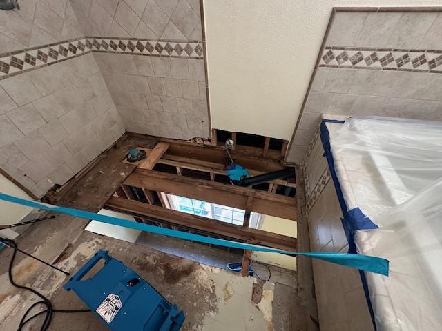 Our team inspected the upstairs restroom to locate the source of the tile leak, performed the necessary repairs to stop further water intrusion, and addressed the affected drywall and wood areas. We also assessed and stabilized the water-damaged wood floors to prevent additional issues.